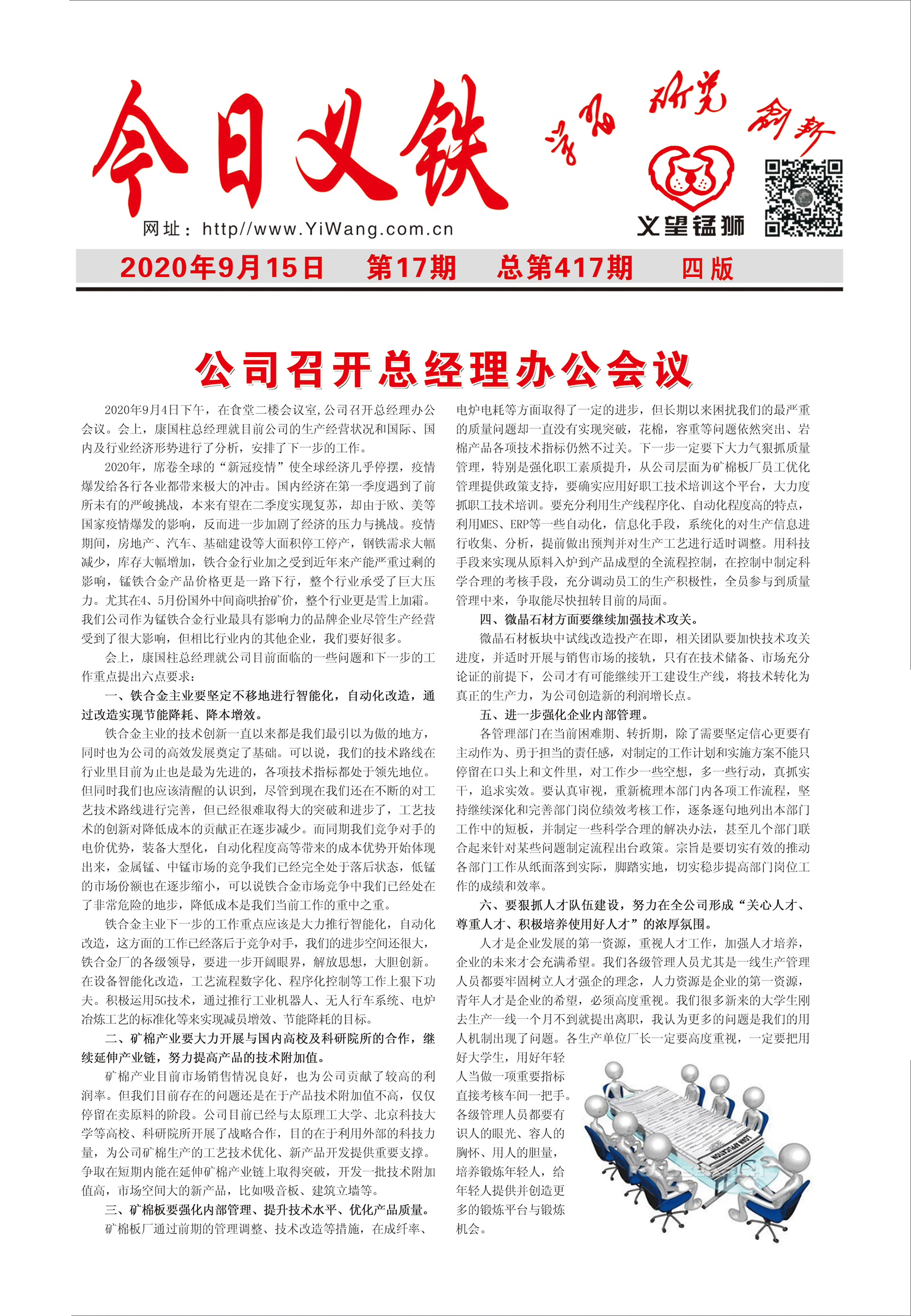 2020年9月4日下午,在食堂二樓會議室,公司召開總經(jīng)理辦公會議。會上,康國柱總經(jīng)理就目前公司的生產(chǎn)經(jīng)營狀況和國際、國內(nèi)及行業(yè)經(jīng)濟(jì)形勢進(jìn)行了分析,安排了下一步的工作。