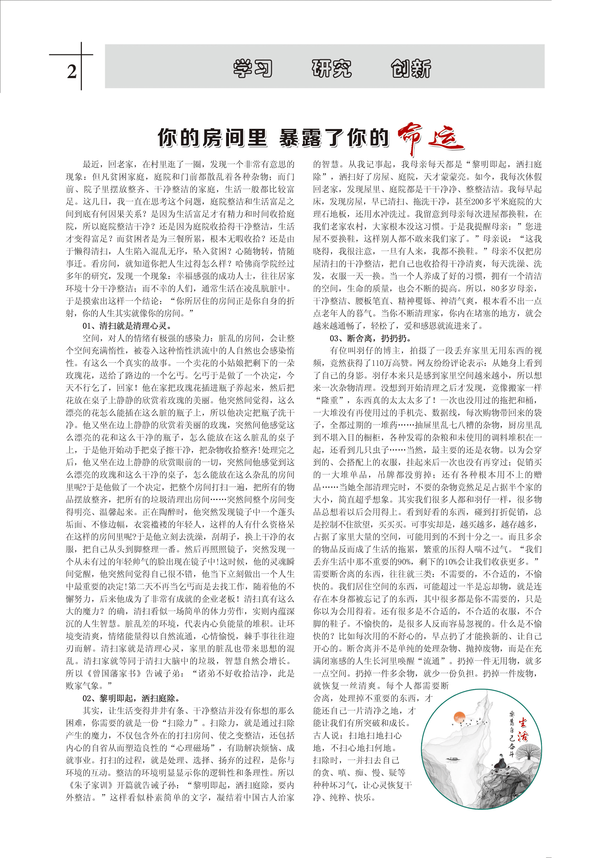 最近,回老家,在村里逛了一圈,發(fā)現(xiàn)一個(gè)非常有意思的現(xiàn)象:但凡貧困家庭,庭院和門前都散亂著各種雜物;而門前、院子里擺放整齊、干凈整潔的家庭,生活一般都比較富足。