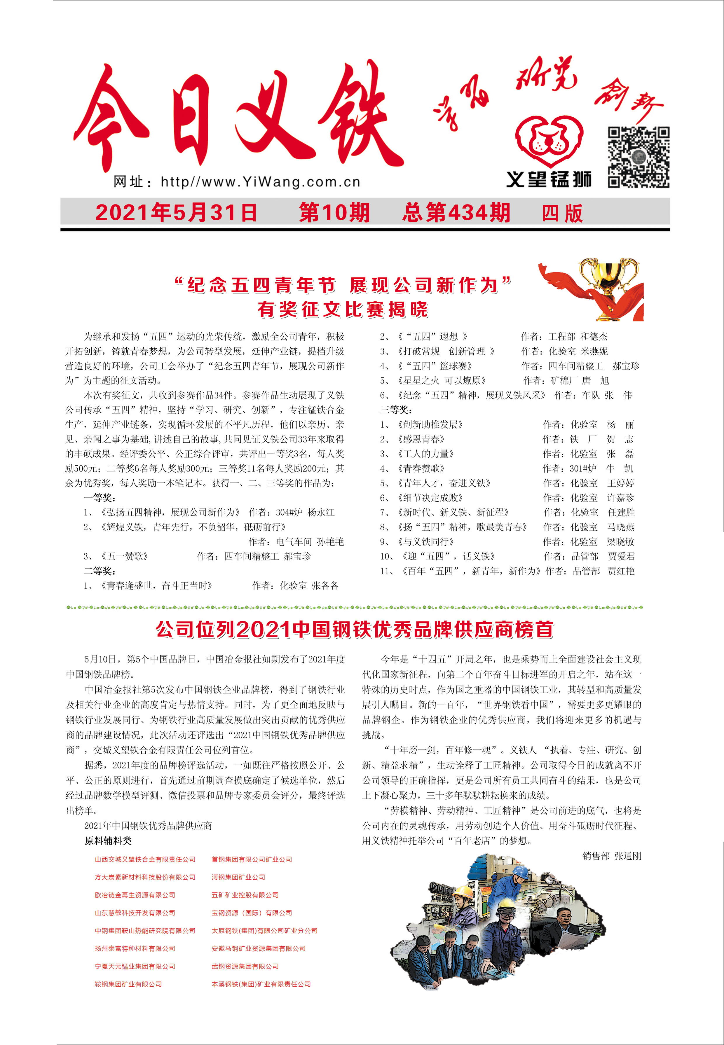 5月10日,第5個中國品牌日,中國冶金報社如期發(fā)布了2021年度中國鋼鐵品牌榜。中國冶金報社第5次發(fā)布中國鋼鐵企業(yè)品牌榜,得到了鋼鐵行業(yè)及相關(guān)行業(yè)企業(yè)的高度肯定與熱情支持。同時,為了更全面地反映與鋼鐵行業(yè)發(fā)展同行、為鋼鐵行業(yè)高質(zhì)量發(fā)展做出突出貢獻(xiàn)的優(yōu)秀供應(yīng)商的品牌建設(shè)情況,此次活動還評選出“2021中國鋼鐵優(yōu)秀品牌供應(yīng)商”,交城義望鐵合金有限責(zé)任公司位列首位。