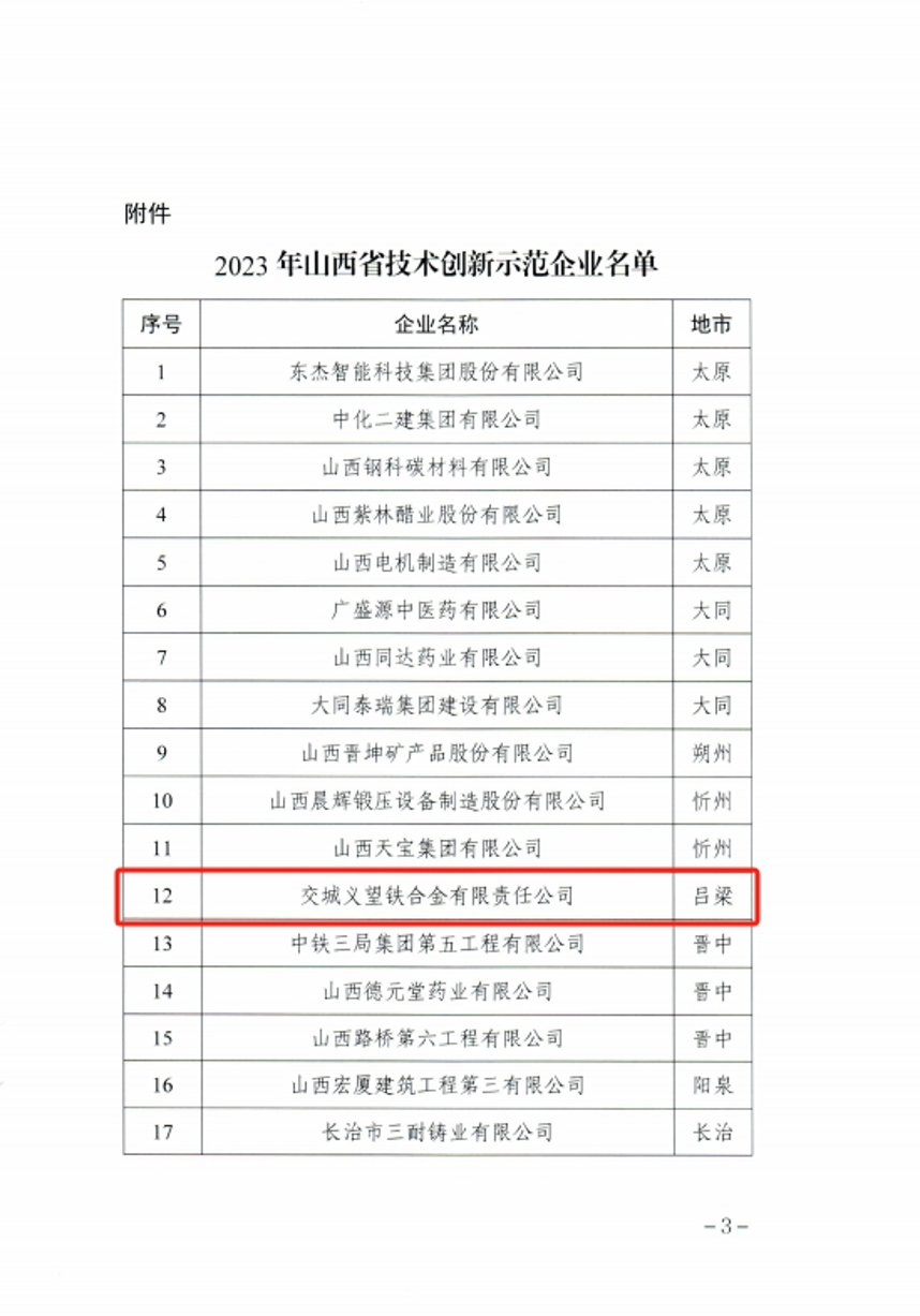 10月31日,山西省工信廳發(fā)文公布了2023年山西省技術(shù)創(chuàng)新示范企業(yè)名單,義鐵公司榜上有名,公司又新添一項殊榮。